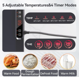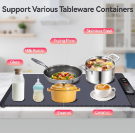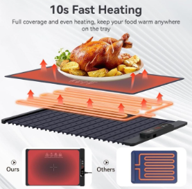 ✅ Quick & even heating – Large heating wire warms food rapidly and uniformly. ✅ 5 temperature levels (140°F–212°F / 60°C–100°C) to suit different warming needs. ✅ 4 timer settings (up to 240 minutes) to keep food warm for hours. ✅ High-quality silicone – Flexible, heat-retaining, easy to clean, and space-saving roll-up design. ✅ Versatile compatibility – Works with metal, ceramic, glass, and enamel tableware (avoid plastic or sealed items). ✅ Child safety lock – Locks control panel to prevent accidental operation by children. ✅ Perfect for any occasion – Ideal for family dinners, parties, buffets, and festivals CONTENTS IN THE BOX: 1 x Electric Warming Tray 1 x USB Cable 1 x User Manual 1 x Storage Bag for Warming Tray 1 x Cable Ties